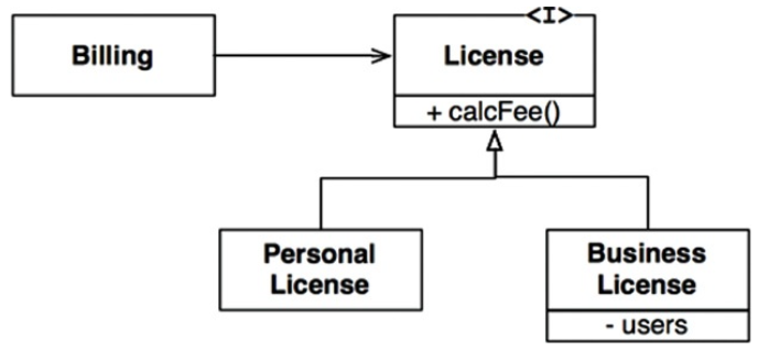 License 클래스가 있다. 이 클래스는 calcFee()라는 메소드를 가지며, Billing 애플리케이션에서 이 메소드를 호출한다. License에는 PersonalLicense와 BusinessLicense라는 두 가지 '하위 타입'이 존재한다.