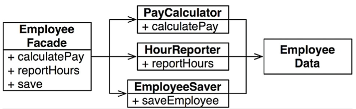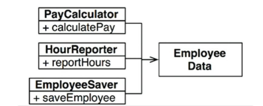 }EmployeeData는 상태만 갖는다.calculatePay,reportHours,saveEmployee는 각각 자기 책임만 갖는다. 그래서 단일 액터의 요구사항에 의해서만 변경된다.- 세 모듈은 서로 참조하지 않는다.