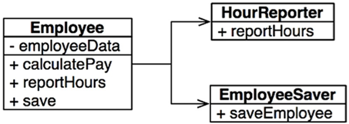 위 클래스는 세 가지 메소드 calculatePay(), reportHours(), save()를 가진다. 아주 당연하게도 SRP를 위반하는데, 이 세 가지 메소드가 서로 아주 다른 세 명의 액터를 책임지기 때문이다.