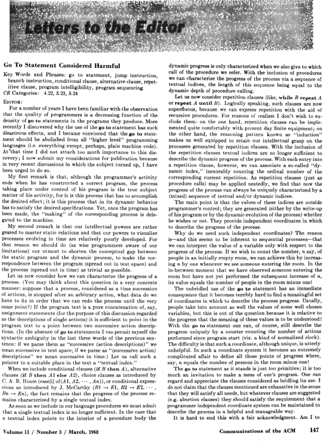 1968년 다익스트라는 CACM(Communications of the ACM) 편집자에게 편지를 썼고 그 내용은 같은 해 3월 호에 실렸다.