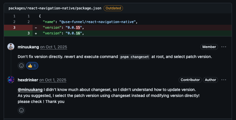 이런게 처음이라서 버전을 내가 알아서 올렸는데 얼마 지나지 않아 메인테이너 중 한명인 강민우님이 코멘트를 남겨주었다. 버전을 직접 올리면 안되나보다. changeset 이란 것을 처음 알았다,, 역시 어렵고 험한 오픈소스 생태계.