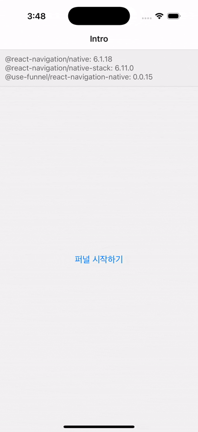 그래서 따로 프로젝트를 만들어서 react-navigation 6 버전대와 use-funnel 0.0.15 버전을 깔아서 동작을 확인해봤다.